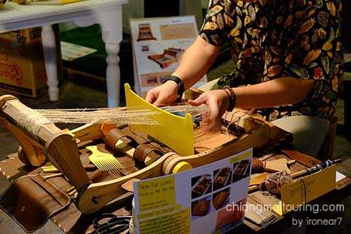 ถัดมา อันนี้เป็น กี่ทอผ้าครับ ที่ถูกพัฒนาออกมาให้ใช้งานสะดวกและง่ายขึ้น แถมยังพกพาได้ โดยกี่ทอผ้านี้สามารถออกแบบลายทอผ้าได้ด้วยตัวเราเอง อีกทั้งยังสามารถนำไปประยุกต์กับการทำผลิตภัณฑ์อื่นๆ ได้อีกด้วย