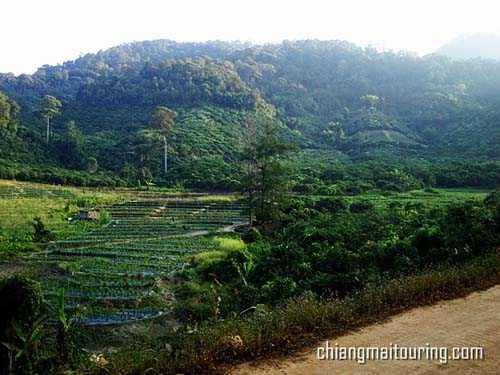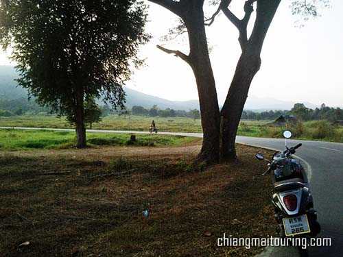 เกือบจะหกโมงเย็นพาตัวลงมาจากขุนช่างเคี่ยนสำเร็จแบบทะลักทุเล พร้อมมีมอเตอร์ไซค์วิบากขับแซงหน้าให้อิจฉาเล่น 4 – 5 คัน ว่ายางรถมันเจ๋งและเหมาะสมกว่ากับสภาพถนนแบบนี้ (ถนนเป็นทรายนิดๆ) โดยบริเวณรอบๆ ก่อนเข้ามายังห้วยตึงเฒ่า มีวิวภูเขา และทุ่งนาให้ได้ชมกัน ถือว่าคุ้มพอสมควรกับการขับฝ่าด่านทะลุลงมา