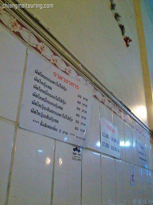 เมนูมีให้สั่งกันเยอะครับในเรื่องของผัดไทย ทั้งผัดไทยธรรมดาไม่ใส่กุ้ง ผัดไทยกุ้งสด ผัดไทยหมี่กรอบไม่ใส่กุ้ง ผัดไทยหมี่กรอบกุ้งสด ผัดไทยวุ้นเส้นธรรมดาไม่ใส่กุ้ง และผัดไทยวุ้นเส้นกุ้งสด ราคาเริ่มต้นที่ 30 บาท ถ้าจะสั่งพิเศษก็คิดเพิ่ม 5 บาท